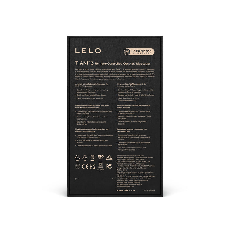 Tiani™ 3 es la versión mejorada del masajeador para parejas de LELO galardonado con el Red Dot Design Award, creado para ser llevado por la mujer al hacer el amor. Sus potentes vibraciones proporcionan sensaciones focalizadas en el clítoris, mientras que su diseño de suave silicona brinda máximo placer y comodidad. Sumergible, recargable y controlado con mando a distancia, Tiani™ 3 es el diseño ideal de LELO para compartir orgasmos simultáneos en pareja.